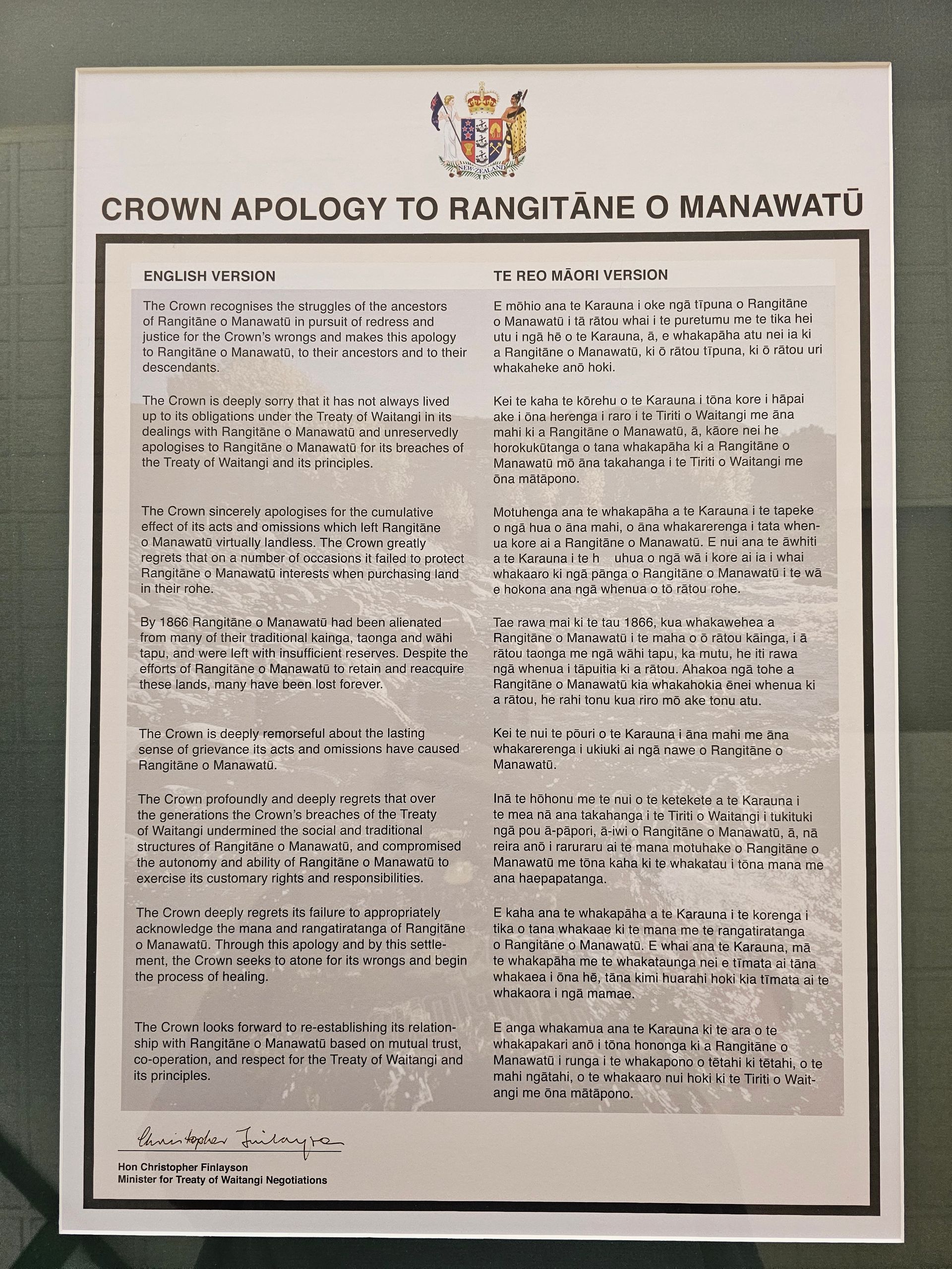 The Crown is deeply sorry that it has not always lived up to its obligations under the Treaty of Waitangi in its dealings with Rangitāne o Manawatū and unreservedly apologises to Rangitāne o Manawatū for its breaches of the Treaty of Waitangi and its principles.